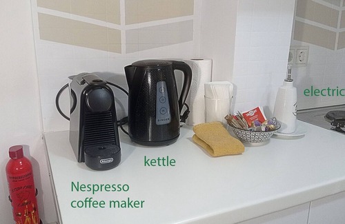 Small cooker, small fridge/freezer, microwave, Nespresso machine, milk frother, kettle, sandwich griller, food chopper, utensils, coffee, tea, olive oil and basic condiments.