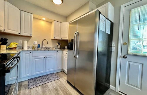 The kitchen is small, but it is fully equipped with everything you need to cook an enjoyable meal. It has an oven/range, a full-size refrigerator, a microwave, and a dishwasher. There is a table off the kitchen area with seating for four. Sit and enjoy a family meal or game night.