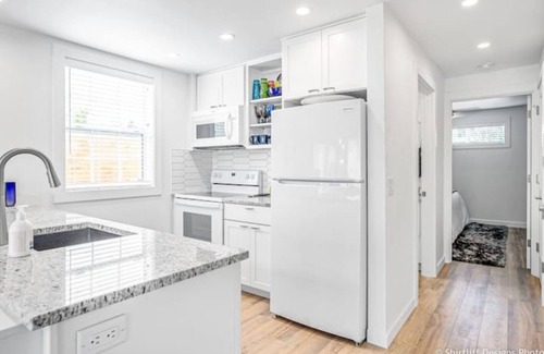 Newly renovated, King bed downstairs and Queen up stairs, each with their own bath. Well appointed and has a washer/dryer. Off street parking.