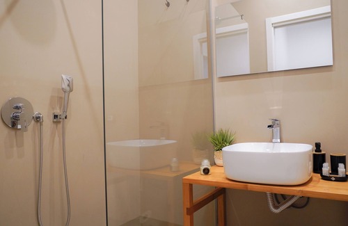 While you're here, you can enjoy all the comforts of home and more, including WiFi and a bidet, as well as air conditioning and an ironing board. Other amenities include laundry facilities, towels, soap, and toilet paper.
