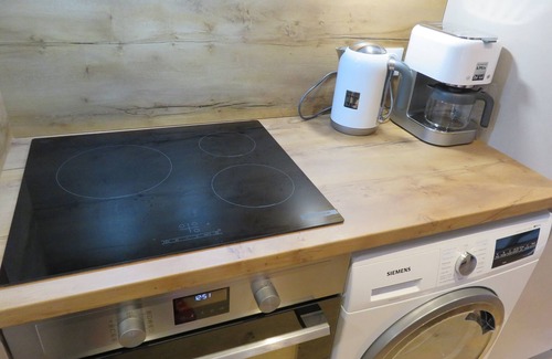 The kitchen is equipped with an oven, a stovetop, and a refrigerator, as well as a coffee maker, an electric kettle, and a microwave. Enjoy the free WiFi and TV. And you won't have to pack extra clothes, because you'll have a washer and dryer, too.