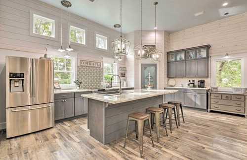 The round in the center of the room is perfect for dining or play games. The farmhouse trestle table seats up to 10. A lovely large chandelier hangs overhead. For a snack or to talk to the cooks, snuggle up to the 10' kitchen island on a bar stool. The Kitchen has loads of counter space for multiple cooks. There's a single bowl granite composite sink with garbage disposal, dishwasher, and a microwave on the other side of the island. A french door refrigerator and an electric range are flanked by counter space. Find lots of small appliances and room for groceries in the walk-in pantry. A coffee bar sports a 10 cup coffee brewer and a Keurig with glass & dishware storage overhead.