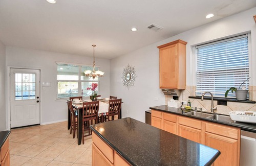 Elevate your vacation experience with this huge 5 bedroom 3.5 bathroom house. Boosting over 3253 square feet of living space. This house comes with a heated swimming pool, spa, outdoor kitchen, and huge covered patio for maximum entertainment. The master bedroom is conveniently located downstairs. The 4 bedrooms upstairs are separated by bathrooms. Plenty of room for everyone to spread out. There's Air Hockey Table, Arcades, XBox and PlayStation System to keep you entertain. No backyard neighbors for extra privacy.