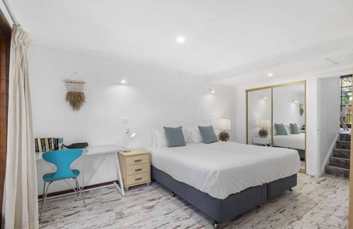 The self-contained studio on the ground floor opens out onto the BBQ area by the pool and has a queen bed, dining/ seating area, kitchenette, private bathroom and laundry facilities.