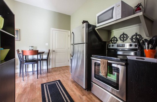 The apartment has a full kitchen (fridge, dishwasher, stove/oven, microwave) , living room and separate bedroom (queen size bed) with full bathroom.