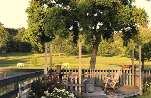 Whether you're exploring the nearby attractions or simply relaxing in the comfortable living spaces, we think our place will help you experience everything the country roads have to offer. Want to be serenaded by a chorus of frogs under a canopy of trees, explore the night sky, or grill dinner out in the open? We've provided multiple outdoor spaces to unwind with family and friends. A 10-foot granite bar located on the spacious 48' long covered back porch offers sweeping views of the ranch, small pond, and grassy fields where the horses roam. The bar area also doubles as a kitchen with a 3-burner stove, oven, dishwasher, full sink, and small fridge. Cookware and dishes are provided.