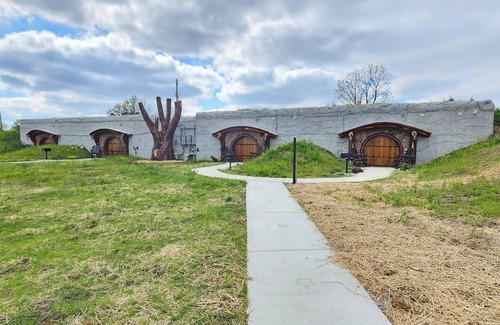 Restin' Holes is a Kentucky village on the Bourbon Trail. This Unit (D) is 1 of the 4 cozy, underground units on the property. This 572 sqft getaway features a king bed, Roku tvs, WiFi, fireplace, kitchenette, dining area, outdoor grill, desk, queen bunks room, washer/dryer, and walk-in shower bathroom. Many shared amenities including: swimspa hot tub, firepit/swings, sauna, gym, waterfall, painted murals, garden, fresh eggs, playground, & outdoor movies.