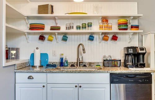 KITCHEN: Dishwasher, stove/oven, refrigerator, microwave, toaster, drip + single-serve coffee maker, cooking basics, dishware + flatware, trash bags + paper towels, bar seating