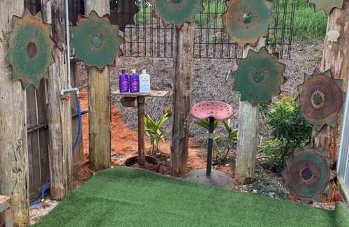 This beautiful escape from reality is ideal with couples or families with small children. The couch converts into a bunk bed that is rated for 80 pounds. Keep in mind the full size bed is 6ft long so be mindful if you are tall. There are common area toilets and sinks about 100ft from the camp site and set up with an outdoor shower used by the juice box camper only for complete privacy. There is a functional sink, mini fridge, kettle, toaster oven, etc. inside the camper for easy quick meals. All other items must be cooked outside. This unique stay is ideal for adventurous people who like quiet, private locations but are still close to modern convenience like our delicious restaurants in downtown Fairhope and beautiful white sandy beach in Gulf Shores. Get the best of both worlds at The Juice Box!