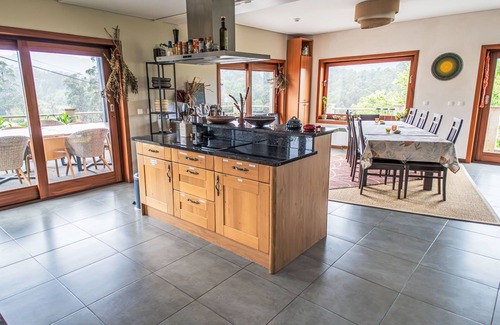 "Rio Lima Retreat", 8-room villa 350 m2 on 2 levels, south-west facing position. Very tasteful and cosy furnishings: 4 rooms, each room with 2 beds (90 cm, length 200 cm), shower/WC and electric heater. Exit to the terrace. Open kitchen (oven, dishwasher, 4 induction hot plates, toaster, kettle, microwave, freezer, electric coffee machine, cooking island) with dining table. Exit to the terrace. Upper floor: living room with cable TV, flat screen and electric heater. 2 rooms, each room with 2 beds (90 cm, length 200 cm), shower/WC and electric heater. Exit to the terrace. Porch. Terrace furniture, deck chairs. Very beautiful view of the mountains, the swimming pool, the garden and the river. Facilities: washing machine, iron, children's high chair, baby cot for up to 2 year olds, hair dryer. Internet (WiFi, free). Parking at the house. Please note: suitable for families. No lift. (including a large exercise/Yoga room). 154456/AL