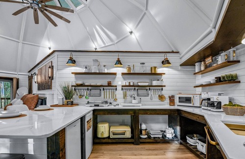 Welcome to your dream getaway kitchen—where modern luxury meets nature's charm. You'll find everything you need in this well-equipped kitchen—from a coffee station to a full set of cookware—beautifully arranged for ease and comfort. Soft lighting from industrial-style sconces adds a warm glow, while the large windows and French doors offer stunning views of the surrounding trees, making you feel truly immersed in nature. And yes, even your furry friend is welcome—there's a chic elevated pet bowl set waiting below the counter. Whether you're cooking a romantic meal or just enjoying the peaceful forest setting, this kitchen is designed to make your stay feel like home—only better.