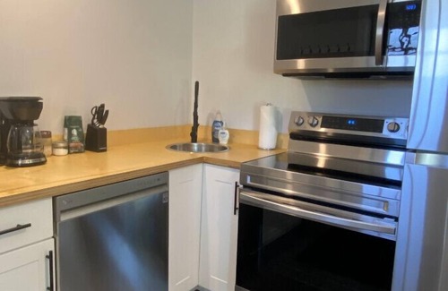 Large sliding doors bring the beauty of nature inside, letting you enjoy the soothing sounds of the river and a refreshing breeze. The Queen-sized bed, dressed in inviting duvets and plush pillows, promises restful nights, while thefully equipped kitchen makes meal prep a breeze. Relax in the cozy living room with a quaint seating area and a smart TV for streaming your favorite shows. The private bathroom features a tub/shower combo and comes stocked with essentials, including body wash, shampoo, conditioner, a hair dryer, and plenty of extra towels.