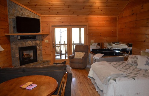 This luxury grandroom/studio style cabin has an open common living/bedroom area and a private bathroom. The property is on the VA Creeper Trail and Laurel Creek which provide a peaceful place to spend time within steps of your back door. The large covered deck offers ample room for entertainment or just rocking away time as you look over the trail and creek. Spend quality time with family and friends in the open living area with flat screen TV (DirecTV service) wireless Internet and a sleeper sofa that can sleep 2 people. The kitchen area is fully equipped with all the supplies you will need. Enjoy meals in the adjacent dining area. The queen bed and jacuzzi tub on the other side of the cabin make this an option for that perfect romantic getaway as well. These are "grand room" cabins (much like a studio), they do have an enclosed bathroom. You will truly enjoy your stay at this cabin and want to return year after year to this peaceful mountain retreat! These are some of the nicest cabins available in the area. Come see for yourself.