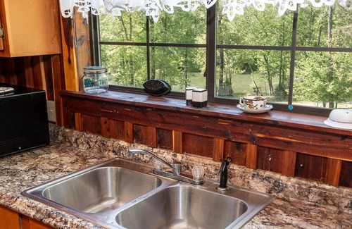 This cabin gives you the ability to spend all day on the river or nearby Lake Greeson, and rest easy on the beautiful river view in the evening. All the areas are spacious with plenty of comfort for a multi-family stay---it's a triplex! Enjoy being with your group or retreat to your private downstairs room for your seclusion. There are two levels of exterior covered balconies that offer plenty of indoor-outdoor living. Sip your morning coffee while hearing the river water below. The cabin offers beautiful scenery and you may even see a deer in the yard.