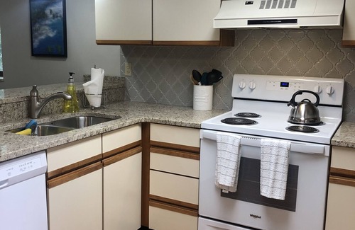 KITCHEN: Fully equipped, cooking basics, microwave, drip coffeemaker, toaster, coffee, sugar, creamer and tea, 3-seat hightop bar, dishwasher