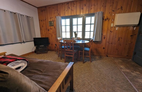 Escape to Cabin #6 at Riverside Point, a charming retreat nestled amidst the natural beauty of Park Rapids. This rustic 2-bedroom, 1-bathroom cabin offers a cozy haven for your Northwoods getaway. Step inside to discover a quaint living room adorned with a full futon, perfect for relaxation after a day of adventure. The small kitchen is equipped with all the essentials for cooking up hearty meals, while the cable TV with Roku provides entertainment for cozy evenings in. Unwind in the comfort of the first bedroom's queen bed or the second bedroom's two twin beds, each offering a peaceful night's rest. The bathroom features a shower/tub combination and is stocked with basic necessities, ensuring your comfort throughout your stay.