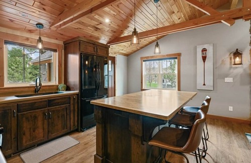 Enjoy the backyard riverside fire pit, river pier, and lawn games. The area is perfect for fishing, ATV/UTV trails, and snowmobiling (trail access via park & ride only, 2 miles away).