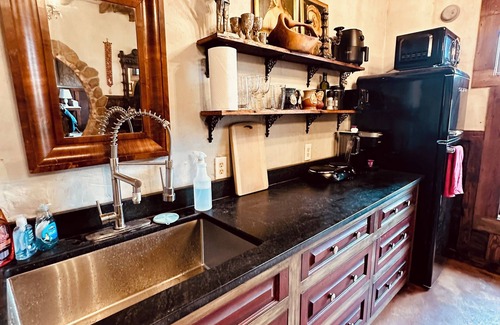 Coming soon: 9/21! Enjoy "second breakfast" in our secluded underground Hobbit House at secluded Riversong Forest Retreat, with a view of the beautiful river. Designed to look like a European castle on the interior, our underground LOTR retreat offers a luxe marble bath, granite kitchen, vintage art, tapestries, tiles, round doors/window and antiques. You'll feel like royalty in the hand painted 1880s bed. Enjoy amenities like pizza oven, firepit, griddle, and outdoor clawfoot tubs.