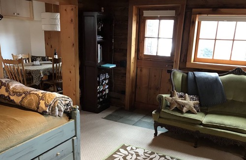 One bedroom, deck, great gardens (including a small stream and pond). We are requiring masks in the outdoor common spaces and walking in and out from the cars. Old world window hardware, claw foot tub, floor-to-ceiling barn sash windows in bathroom. Small rooms, low ceilings, exposed log perlins, plank floors and ceilings, hand scribed chinking. It is rustic and real with artistic touches and is truly unique. The adorable cabin is filled with maps, books, brochures, coupons, recommendations, insider tips and more. The plethora of nooks and crannies, and sense of abundance, belie the small carbon footprint of this green building and garden. The garden is completely chemical free, so everyone can feel great about sitting outside and enjoying the surroundings.