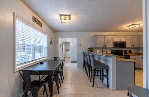 This spacious home is centrally located in the High Country with quick access to Boone, Banner Elk, and everywhere in between! Next to the Watauga River, guests can enjoy the idyllic setting outside or spend time in the newly renovated inside. The main level offers dining in the formal room, with additional seating in the breakfast table and the counter. There is a gorgeous kitchen with matte steel appliances and granite counters, both Keurig and drip coffee, and easy access to the dining or living rooms. Near the front entrance is a half bath for convenience. Off the living area is the primary bedroom with a king bed and Roku TV. The attached full bathroom has a tiled tub/shower combination with jets and granite counters.