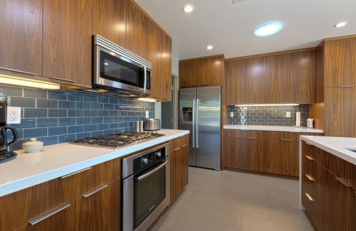 A spacious open great room is the heart of the home. The living room features a vaulted ceiling, a gas fireplace, TV with cable DVR & DVD. It opens to the dining area and a chef's kitchen. The dining area opens directly out to the pool and outdoor living area. The custom kitchen is fully stocked and features stainless appliances, walnut cabinets, classic white quartz counters and an island where guests can gather while you cook or just cook up a cocktail.