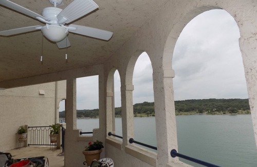 Luxury Waterfront Villa with a 300 sq/ft balcony overlooking 360 degree view of the Lake and South pool on the Island of Lake Travis. Elegantly decorated with a romantic fireplace in the living room, tavertine tile floors, granite countertops. Full size kitchen with separate washer/dryer area. The large bathroom is accessible by both Primary bedroom and living area. It features a jacuzi tub and separate walk in shower. There are many amenities on the island that will keep you and guests entertained.