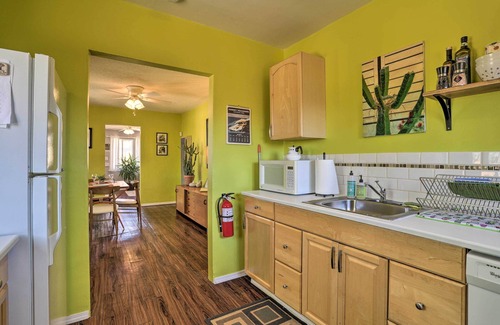 Take a break from the city and come 'home' to this retro-chic Joshua Tree vacation rental. The colorful 2-bedroom, 1-bath house is perfect for small families or couples traveling together. During the day, hike the Hidden Valley Nature Trail or take in the desert majesty from Black Lava Butte and Flat Top Mesa. Stargazers will love the view of the Milky Way at nighttime, with a blazing fire pit keeping the whole group warm in the cozy backyard. Your ideal vacation is waiting at 'Rockview House'!