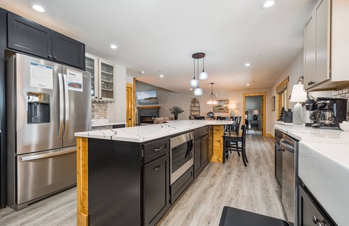 Designed to delight the chef in your group, the kitchen includes highlights like a farm sink, under-counter ice maker, and a five-range gas stove. Make big breakfasts or delicious dinners that can be shared around the dining table. If you need extra space, there is seating for five at the kitchen island too.
