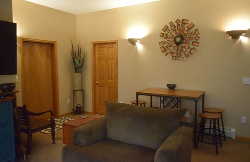 On the other side of living room features a huge master bedroom, walkin closet shower and spa tub. The downstairs holds the family room. Very spacious and possilby a place for a couple additional roll a way beds. There's a half bath and huge sectional, big tv , a game table and a cove for office or crafts. There is also a 2 car garage that could be included with rental upon request.