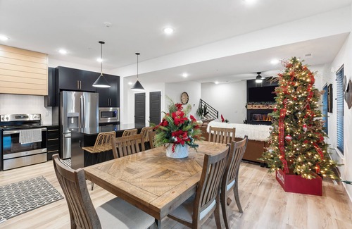 The bright and cheerful interior perfectly blends modern furnishings with rustic chic décor, the open floor plan accommodating both relaxation and entertainment. Gather the crew together on the plush leather U-shaped sofa to stream a movie while the centerpiece electric fireplace keeps you warm and toasty on the cooler nights. Steps away, the fully equipped kitchen showcases stainless steel appliances, stone countertops, and sleek cabinetry stocked with all the comforts of home. Gather together for formal meals or an energetic family game night at the dining room table with seating for 6. After long days exploring the area, end your evening with a soothing soak in the private outdoor hot tub while you wind down with a refreshing beverage.