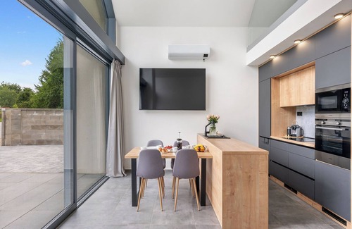 Modern, luxurious holiday development. 3 houses in the resort. In a quiet, sunny position. For shared use: property 600 m2. Private: terrace, garden furniture, barbecue. In the complex: sauna (extra). Massage (extra). Hot tub, relaxation room, central heating system. House maid on request (included). Parking on the premises. Shop 5 km, supermarket 5 km, restaurant 5 km, bus stop "Počátky, Prostý" 100 m. Golf course (18 hole) 21 km. Nearby attractions: Lázně Svatá Kateřina, Zámek Žirovnice 9 km, Zámek Žirovnice, Popelín, Studená 9 km, Česká Olešná 10 km, Telč (UNESCO) 20 km, Zámek Jindřichův Hradec 25 km, Zámek Červená Lhota 35 km, Golf Telč(18 jamek)21km, Mnich(36 jamek) 27 km. Hiking paths: Jihlava 38 km, Třeboň 50 km. Overall, the superbly designed glass villa RomanceRelax is dominated by a duplex bedroom with a freestanding bathtub. Beautiful view through the all-glass wall of the adjacent pond. The owner can arrange Ayurvedic massages, quad bikes, animation programs, horseback riding. Petanque court. Suitable for couples, peace, nature, wellness, romance,..