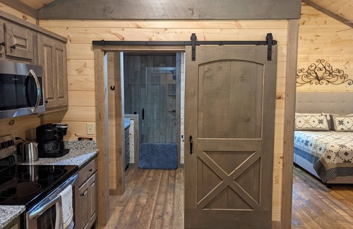 -The cabin is an open concept design with a fireplace in the center and a bed in the back with a full bathroom and kitchen.