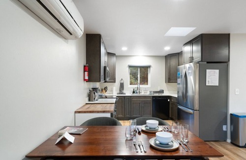 A standalone guesthouse with private entrance and parking, private deck, California King bed, modern bathroom, natural lighting through skylights, and full kitchen.