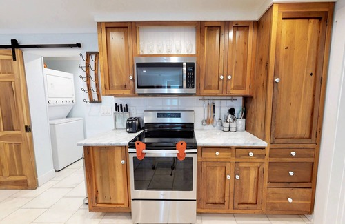 The Kitchen features Stainless Appliances. Marble and Handmade Butcher Block Counters. Farm Sink and Subway Tile. And comes fully stocked with all you will need to cook a gourmet meal.