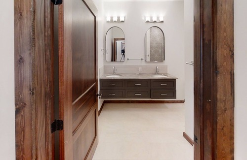 oversize shower with dual shower heads. One master bedroom with a Queen bed.