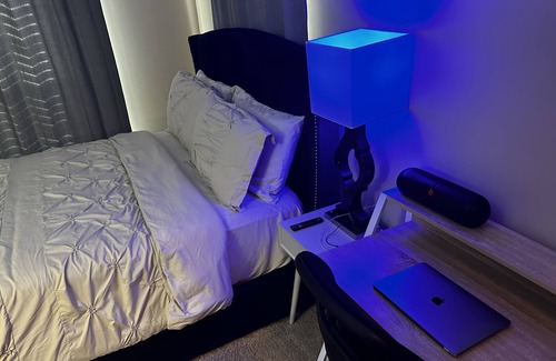 Welcome to your cozy retreat! Your room is equipped with everything you need for a comfortable and convenient stay. Unwind on our plush Queen bed and enjoy your favorite shows on your own large smart TV. Groove to your playlists on the Beats by Dre Bluetooth speaker or relax in our comfortable chair. Stay productive at the computer desk and enjoy a fresh cup from the Keurig coffee maker. We've got you covered with a refrigerator stocked with water and soda drinks. Plus, an ironing board and iron, closet, towels, toilet paper, cleaning supplies, utensils, snacks, phone charger, and body wash are all at your disposal. And, rest easy knowing your room has a secure door lock. We've thought of everything to make your stay stress-free and enjoyable!