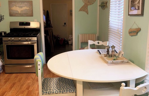 The cottage sits on a corner lot that is lined by a white picket fence. Includes both a grill and fire pit, bikes and kayaks and has everything needed for a relaxing stay.