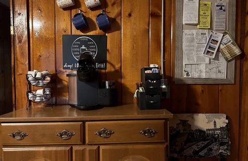 This is a half log exterior cabin with knotty pine interior walls throughout. The cabin is surrounded by pine trees to give that nestled in the woods feeling while providing you with in town living. Just a few blocks away (walking distance in the summer) from Ma Deeters (a well known dining experience for this area). Trail heads are just a block away. Don't have the toys to play on the trails with?? That's ok, you can rent them from Luzerne Express just up the road. The AuSable River is only a 10 minute drive (you can also rent tubes and canoes from Luzerne Express). The Boardwalk is a great little location just a five minute drive from the cabin that gets overlooked because it is not advertised much but I highly recommend it.