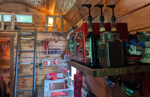 SLEEPING spaces: 3 beds total: 1 bed on main floor with a pretty bed covering, clean sheets & cuddly warm blankets and art on the walls above which create attractive ambiance, nightstand, table lamp, and fun pretty ceiling lights with color setting options. A 2nd bed is in the loft above up a ladder, more pretty decorative bed covering, window, floor lamp & fan + full access to ceiling fan & AC/Heat air. The 3rd bed is a faux-leather sofa which folds out to a twin size bed, linen & blankets are provided.