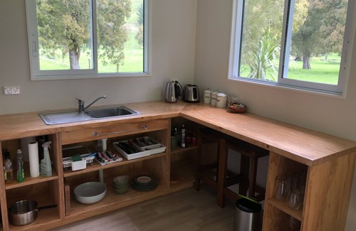 Morepork Cottage contains a gas hob, microwave and a BBQ on the covered in deck.