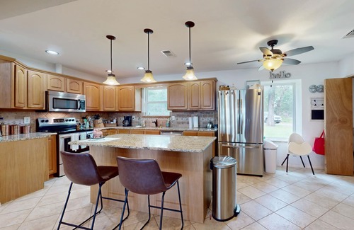 The rest of the house is open and spacious, with a well-equipped kitchen, dining area, and living room at its center. Watch movies together in the evenings, pull up a seat to the desk to catch up on email over the complimentary WiFi, and leave the day's swimsuits in the care of the washer/dryer. In addition to the three bedrooms, a portion of the sunroom is set up as a kids' bunk room stocked with games and toys. Family-friendly extras include two pack-n-plays, a high chair, two booster seats, and two children's cots for flexible sleeping space.