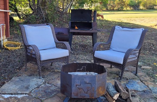 Take it easy at this unique and tranquil getaway. This rustic cabin is nestled in the pines at Birmingham Golf Club and offers a view of the lake and beautiful East Texas scenery. Free range chickens, goats and ducks and a farm style golf course make this a unique place to stay. For the golfers, add a day of golf to your stay for just $30.00 per person. Enjoy coffee in an oversized rocking chair on the deck or a cozy fire in the firepit on the patio.
