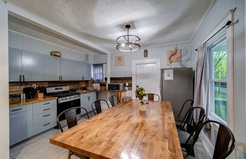 The kitchen features custom wooden countertops and a large island, perfect for cooking and gathering with family or friends. The living room offers a 70” Smart TV and a wood stove, creating a cozy space to relax after spending time outdoors.