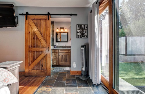 The fully equipped open kitchen boasts rustic knotty hickory cabinets, new stainless steel appliances, and granite countertops, perfect for preparing meals with family and friends. The living room is a cozy haven with a gas fireplace, heated floors, and flat-screen TV for your entertainment.