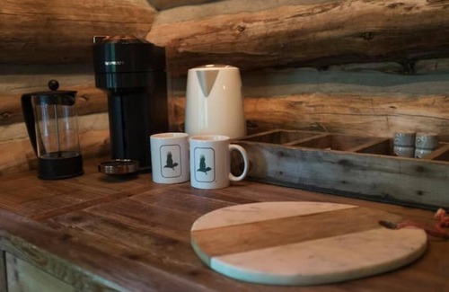 This cozy log cabin is two floors. The first floor includes kitchenette, dining table and sitting area. The compost toilet is tucked away under the stairs. The second floor features a beautiful queen bedroom. You also have private access to a good size outdoor space with screened dining tent and fire pit for your enjoyment. The cabin is located about a 100m short walk from where you park.