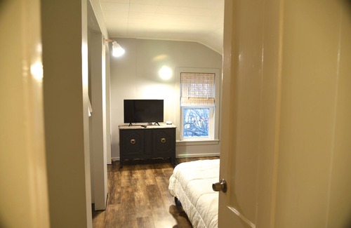 This 100 year old house is situated next to a train track, making it a dream come true for train enthusiasts. The train passes by approximately 10-12 times a day and night, but newly installed windows help minimize noise disruption.