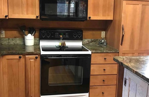 This is a rustic handcrafted real log cabin with natural logs exposed in the kitchen/dining area that serve as the floor joist for the master bedroom. A large natural cedar post is the support for the upper landing off the master bedroom. A handcrafted half log staircase leads to the master bedroom.