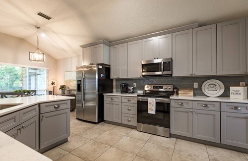 New cabinets with quartz countertops, new appliances with both keurig and a standard coffee pot. Large closet pantry with a few staples to get you started for your stay. The breakfast table has a butterfly leaf and will seat 6 comfortably. The counterheight penisula has two bar stools.
