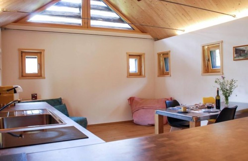 "Rustico Rudico", 2-room cottage 65 m2 on 1st floor, north-east facing position. Object suitable for 2 adults + 2 children. Bright, partly with sloping ceilings, comfortable and wooden furniture furnishings: open large living/sleeping room with 1 sofabed (140 cm, length 200 cm), dining table and radio. Exit to the veranda. 1 double bedroom with 1 double bed (140 cm, length 200 cm). Small, open kitchen (oven, 3 ceramic glass hob hotplates, freezer, electric coffee machine, Capsules for coffee machine (Nespresso) extra). Shower/WC. Electric heating. Parquet floors. Patio. Sitting area. Very beautiful panoramic view of the mountains, the valley and the countryside. Facilities: washing machine, children's high chair, baby cot for up to 2 year olds (extra), hair dryer. Please note: non-smoking house. Maximum 1 pet/ dog allowed. Fire extinguisher. NL-00001842