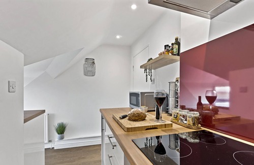 Kitchen: Fully equipped galley style kitchen with induction hob, oven, fridge/freezer, small selection of condiments, Tassimo machine and all of the pots/pans and utensils needed for your stay. Hot drinks provided including Twining’s tea, Nescafe coffee selection and hot chocolate with treats, milk and oat milk sachets.